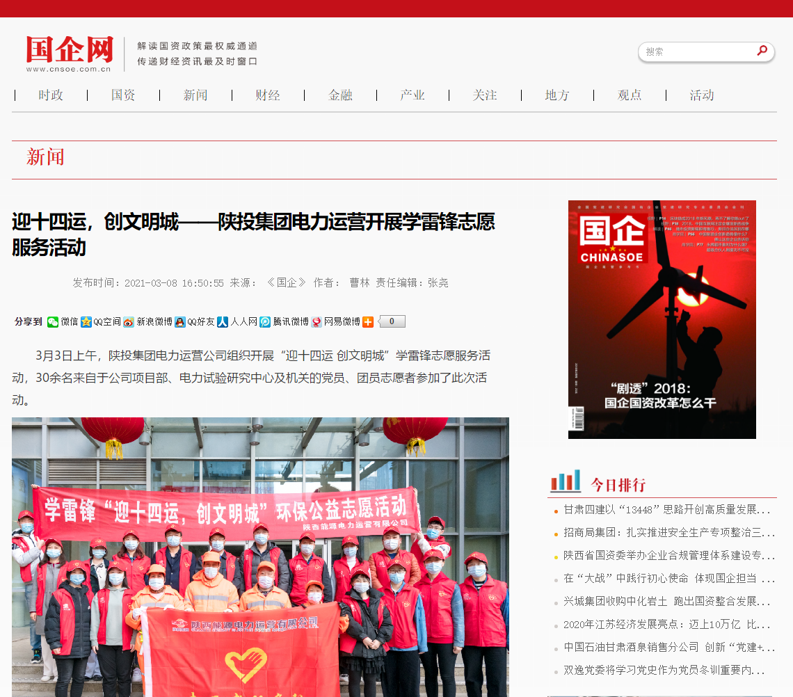 3月3日上午,陜投集團(tuán)電力運(yùn)營(yíng)公司組織開(kāi)展“迎十四運(yùn) 創(chuàng)文明城”學(xué)雷鋒志愿服務(wù)活動(dòng),30余名來(lái)自于公司項(xiàng)目部、電力試驗(yàn)研究中心及機(jī)關(guān)的黨員、團(tuán)員志愿者參加了此次活動(dòng)。
