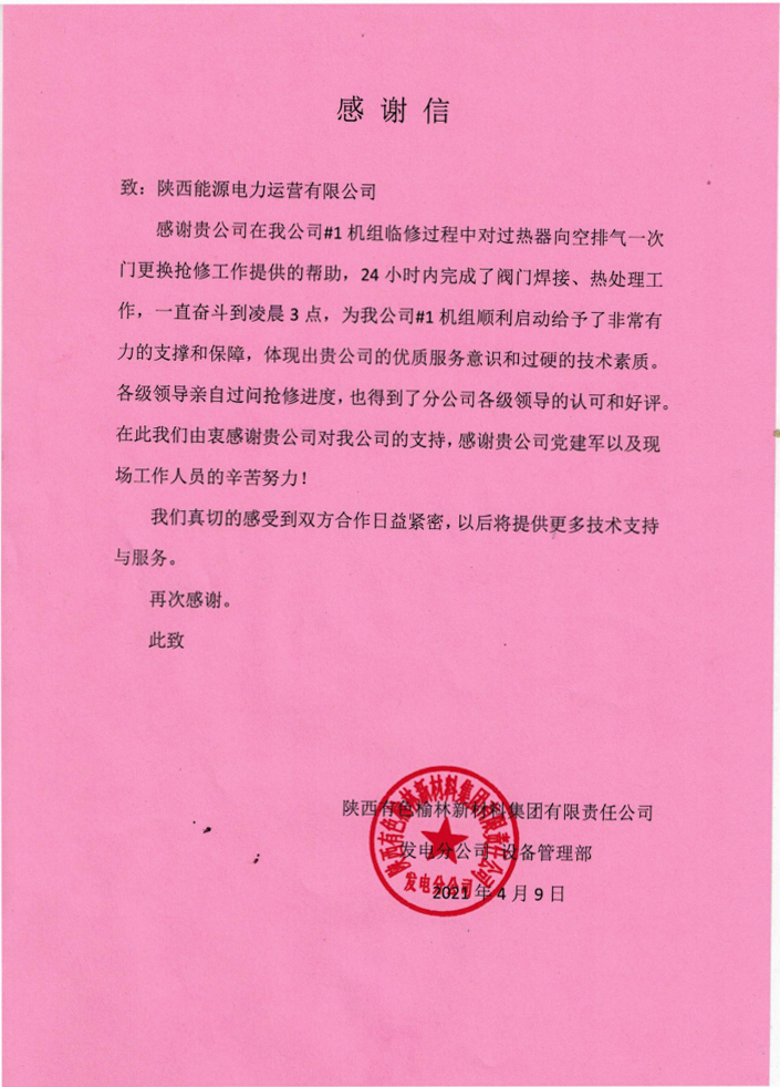 五一”剛過,公司收到陜西有色榆林新材料集團有限責任公司的表揚信。