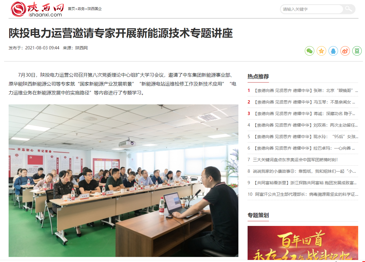 7月30日,公司召開第八次黨委理論中心組擴大學習會議,邀請了中車集團新能源事業部、原華能陜西新能源公司等專家就“國家新能源產業發展前景”“新能源電站運維檢修工作及新技術應用”“電力運維業務在新能源發展中的實施路徑”等內容進行了專題學習。