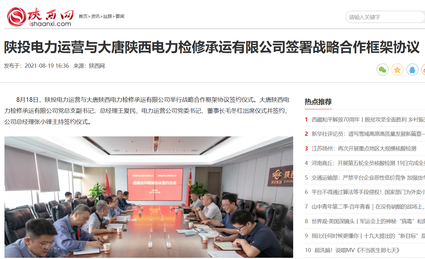 8月18日,公司與大唐陜西電力檢修承運有限公司舉行戰略合作框架協議簽約儀式。大唐陜西電力檢修承運有限公司黨總支副書記、總經理王愛民,電力運營公司黨委書記、董事長毛冬紅出席儀式并簽約,公司總經理張小鋒主持簽約儀式。