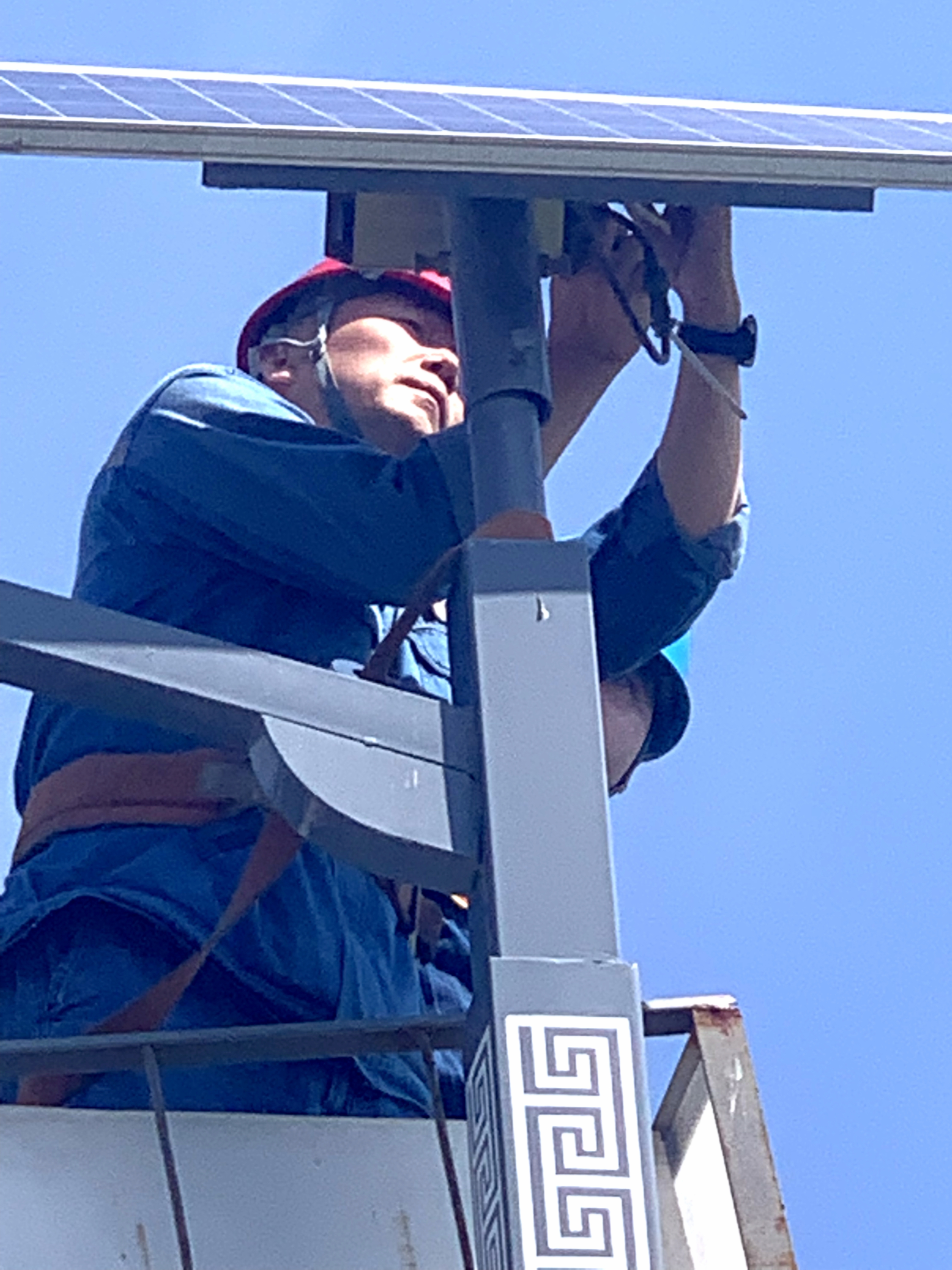 赤日炎炎下,路燈維修小隊的隊員們在做好安全措施后,冒著太陽的炙烤,蚊蟲的叮咬,爬上一根根8米高的電桿,對70盞路燈逐一進行檢查。隊員們對故障路燈進行了測試,排查出了太陽能板、控制器損壞等問題,對線路老化、損壞的燈頭進行維護更換,對太陽能板損壞、控制器燒毀的隊員們進行了詳細統計,列出了采購清單,以便下次集中進行更換處理。