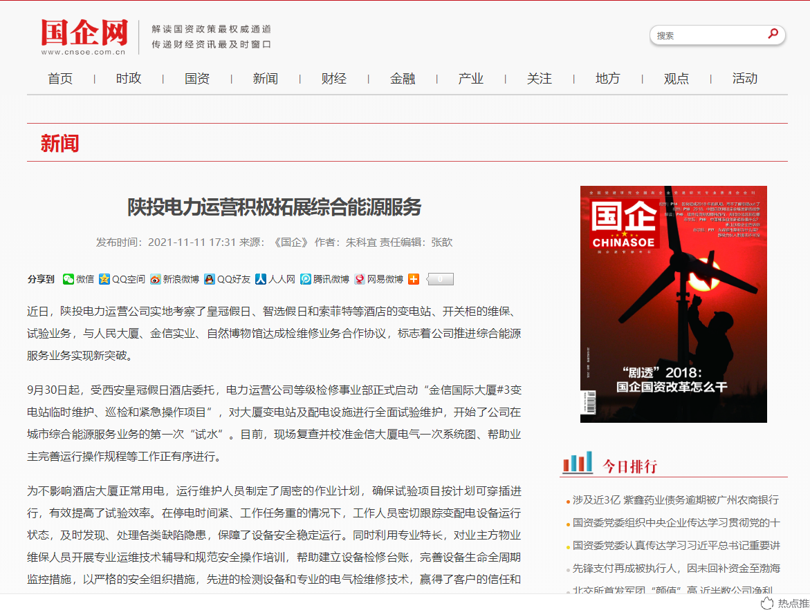 9月30日起,受西安皇冠假日酒店委托,公司等級檢修事業部正式啟動“金信國際大廈#3變電站臨時維護、巡檢和緊急操作項目”,對大廈變電站及配電設施進行全面試驗維護,開始了公司在城市綜合能源服務業務的第一次“試水”。目前,現場復查并校準金信大廈電氣一次系統圖、幫助業主完善運行操作規程等工作正有序進行。
