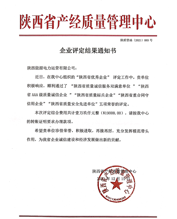近日,經陜西省產經質量管理中心評定,公司榮獲“陜西省質量標兵企業”“陜西省AAA級質量誠信企業”“陜西省質量安全先進單位”“陜西省質量誠信服務雙滿意單位”“陜西省重合同守信用企業”等五項榮譽稱號。