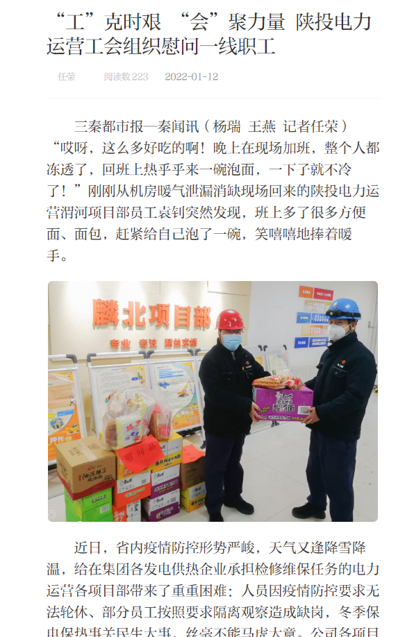 “保供攻堅戰(zhàn),工會在行動。”哪里有困難,哪里就有“娘家人”的溫暖。近距西安不到20公里的渭河項目部,遠到天山腳下的新疆吉木薩爾項目部;陜北的清水川項目部、趙石畔項目部,陜南的商洛項目部,還有陜甘交接處的麟北項目部……僅僅兩天之內(nèi),公司工會的貼心慰問一一送到,給駐守一線的職工帶來了陣陣暖流。