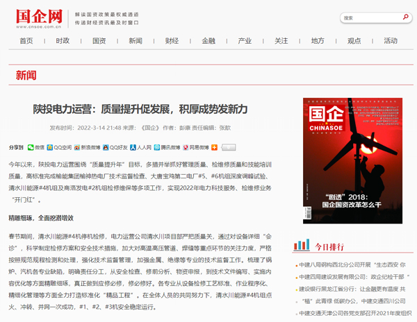 今年以來(lái),電力運(yùn)營(yíng)公司圍繞“質(zhì)量提升年”目標(biāo),多措并舉抓好管理質(zhì)量、檢維修質(zhì)量和技能培訓(xùn)質(zhì)量,高標(biāo)準(zhǔn)完成榆能集團(tuán)榆神熱電廠技術(shù)監(jiān)督檢查、大唐寶雞第二電廠#5、#6機(jī)組深度調(diào)峰試驗(yàn)、清水川能源#4機(jī)組及商洛發(fā)電#2機(jī)組檢修維保等多項(xiàng)工作,實(shí)現(xiàn)2022年電力科技服務(wù)、檢維修業(yè)務(wù)“開(kāi)門紅”。
