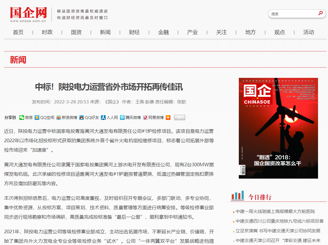近日,陜西能源電力運營有限公司中標國家電投青海黃河大通發電有限責任公司#1爐檢修項目。該項目是電力運營2022年以市場化招投標形式獲取的集團系統外首個省外火電機組檢維修項目,標志著公司拓展外部等檢市場迎來“加速度”。