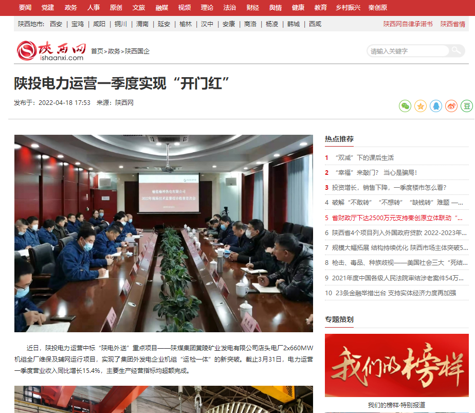 近日,陜投電力運營中標“陜電外送”重點項目——陜煤集團黃陵礦業發電有限公司店頭電廠2x660MW機組全廠維保及輔網運行項目,實現了集團外發電企業機組“運檢一體”的新突破。截止3月31日,電力運營一季度營業收入同比增長15.4%,主要生產經營指標均超額完成。