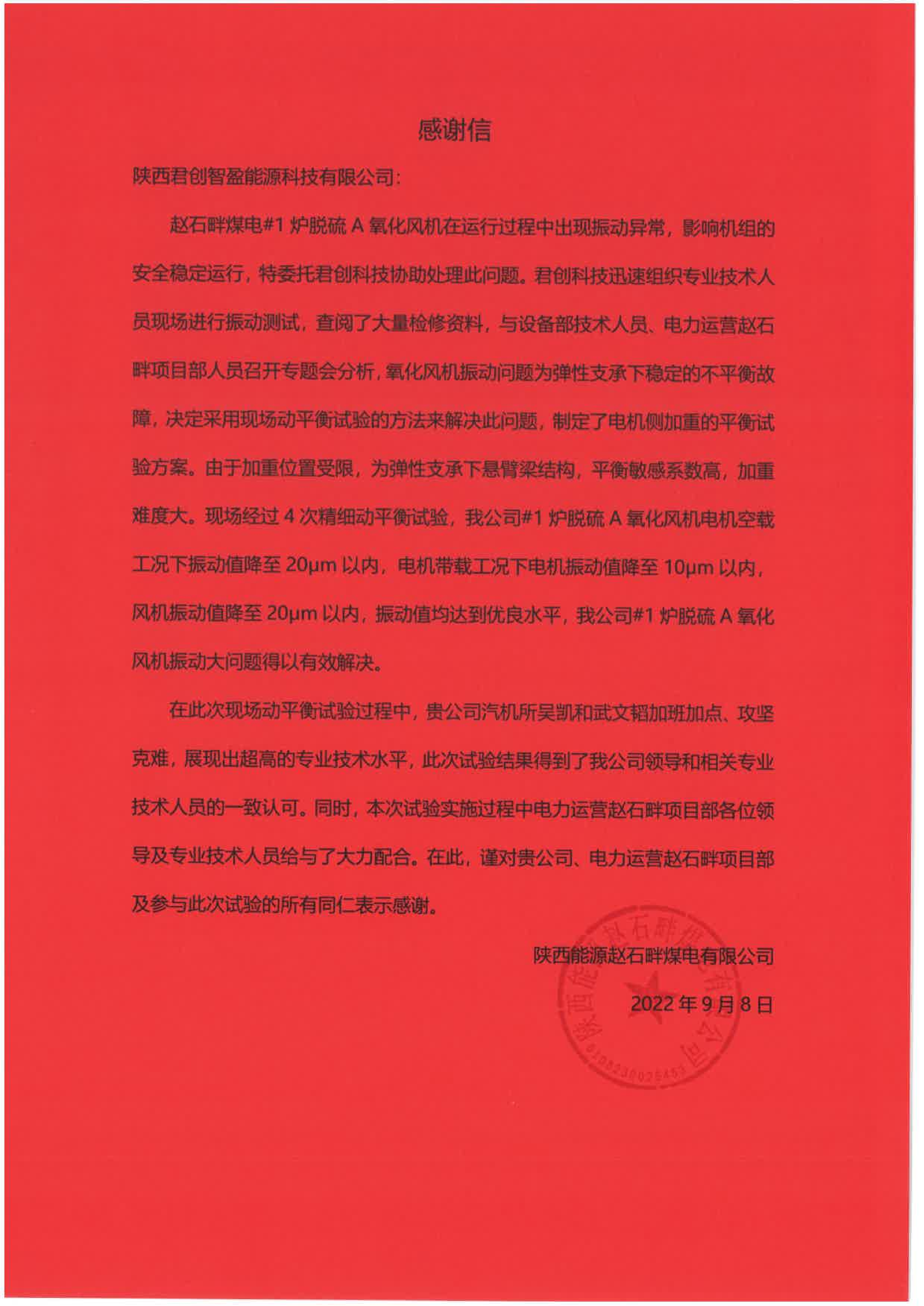 9月9日,趙石畔煤電發來感謝信,對君創科技高質量完成#1爐脫硫A氧化風機動平衡試驗表示感謝。