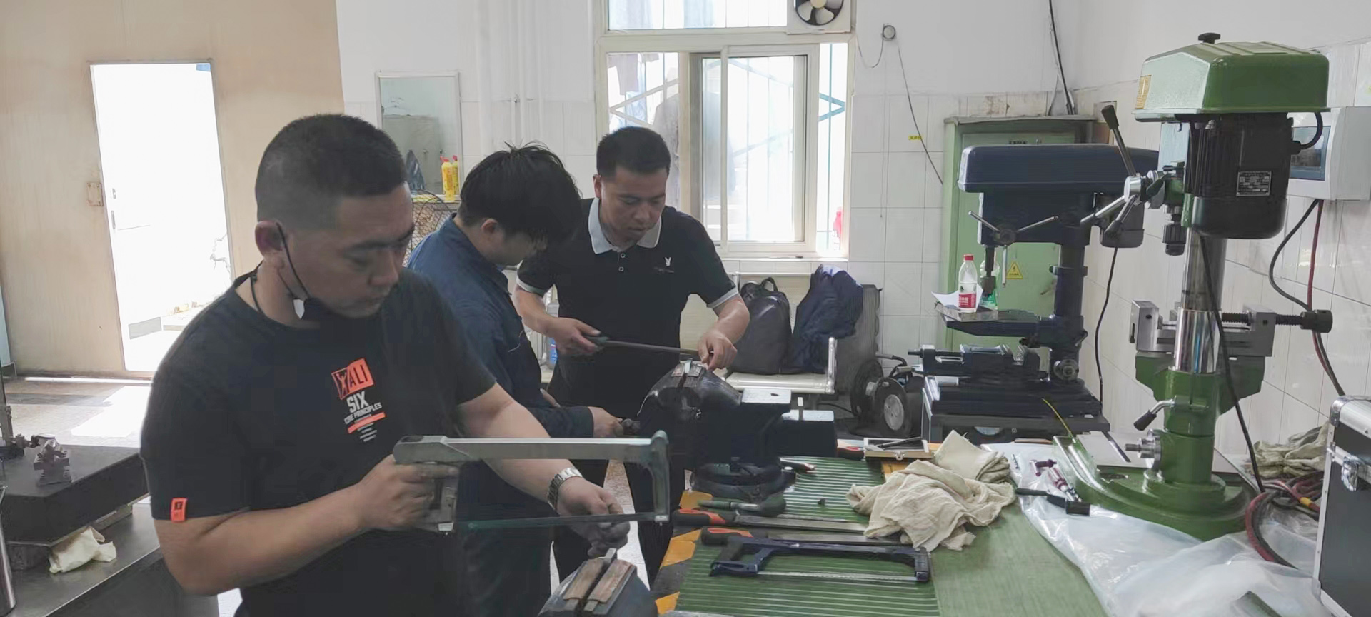 鉗工組選手主動放棄期休息時間,加班加點進行訓練。指導老師針對不同工種,一對一、面對面,示范講解工件加工到0.005mm精度的操作方法,并逐一剖析參賽選手的不足,幫助選手掌握操作技巧。待晚上走出訓練室時,大家全身早已全部被汗水打濕,白色的工作服也被染成了鐵銹色。