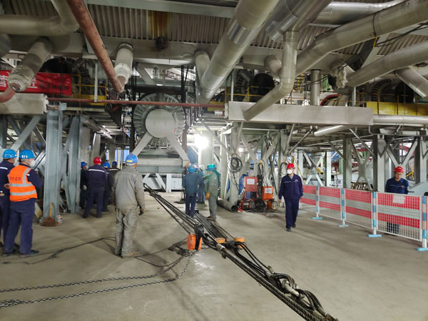 本次所吊運(yùn)的冷渣器重40余噸,長(zhǎng)12米,高3米,對(duì)這個(gè)又高、又長(zhǎng)、又重的“大家伙”來(lái)說(shuō),鍋爐房0米場(chǎng)地顯得尤為狹小。為將它順利請(qǐng)到吊裝位置,吊運(yùn)小組先后割除了主消防母管、水冷壁下集箱給水管等多個(gè)管道。因空間狹小無(wú)法使用大型起吊設(shè)備和常規(guī)起吊方法,吊運(yùn)小組使用“滾杠”+“倒鏈”的方法,一點(diǎn)點(diǎn)將它往里移動(dòng),期間多次調(diào)整轉(zhuǎn)向。重量大、到貨晚致使工期緊張,工作人員輪流“拉纖”,將冷渣器一步步送到指定起吊位置。