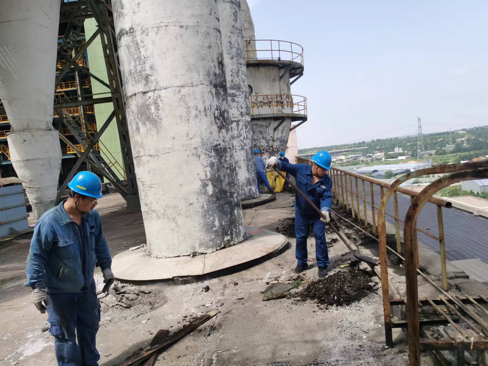 下午三點,驕陽似火,即便是不干活,在屋頂站一會就大汗淋漓,但24米除氧器平臺、循泵房頂、網控樓房頂…到處都是項目部員工忙碌的景象。烈日的炙烤加上高溫管道和煙道散發的熱量,環境溫度高達50多度,背上的衣服已經浸出白色的鹽漬,臉上豆大的汗珠混著灰塵流淌,不一會功夫大家都成了“大花臉”。