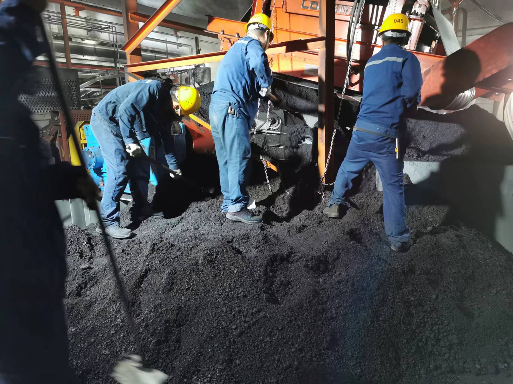 時間緊、任務(wù)急,在積煤最嚴(yán)重的#7帶拉緊小室,所有隊(duì)員面對堆積如小山的濕煤,齊心協(xié)力、配合默契,揮動著鍬鎬,爭分奪秒裝運(yùn)積煤。有的積煤雖然沒那么濕,粘性卻很大,一鍬下去根本鏟不動,只能分割成“豆腐塊”逐一處理,最難對付的還是堆積在設(shè)備下部的積煤,大家直不起腰、發(fā)不上力,清理起來極為困難,只能用最原始的方式一鍬一鍬清理。30多度高溫使得運(yùn)行車間內(nèi)愈加悶熱,不一會兒人人大汗淋漓、手上磨起水泡,汗水浸透工衣,“煤山”也以肉眼可見的速度逐漸變小。經(jīng)過40小時的連續(xù)奮戰(zhàn),輸煤系統(tǒng)恢復(fù)正常運(yùn)行。
