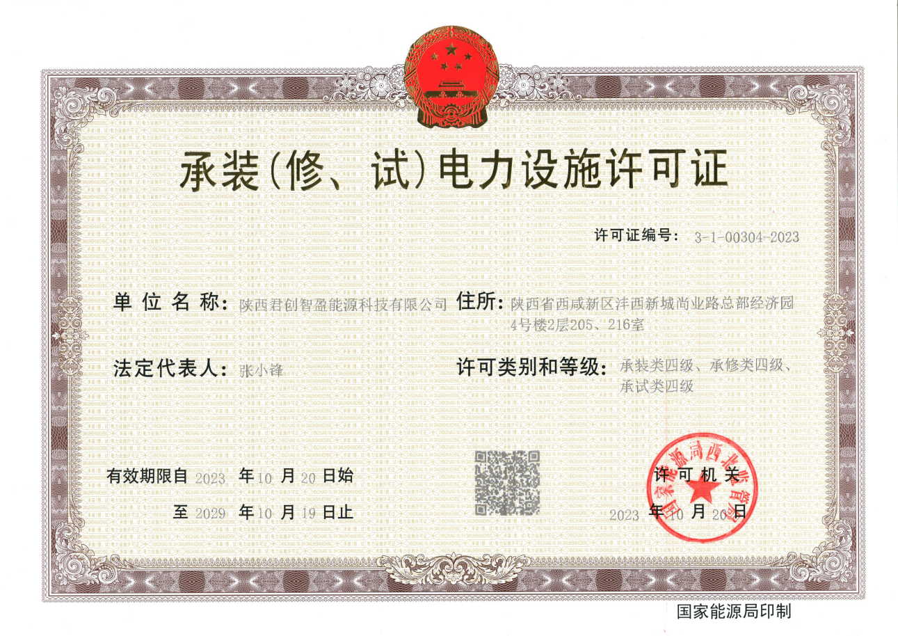近日,經國家能源局西北監管局審核批準,君創科技成功獲得“承裝(修、試)電力設施許可證”資質。