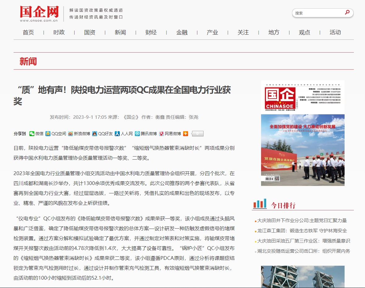 日前,陜投電力運營“降低輸煤皮帶信號報警次數”“縮短煙氣換熱器管束消缺時長”兩項成果分別獲得中國水利電力質量管理協會質量管理活動一等獎、二等獎。