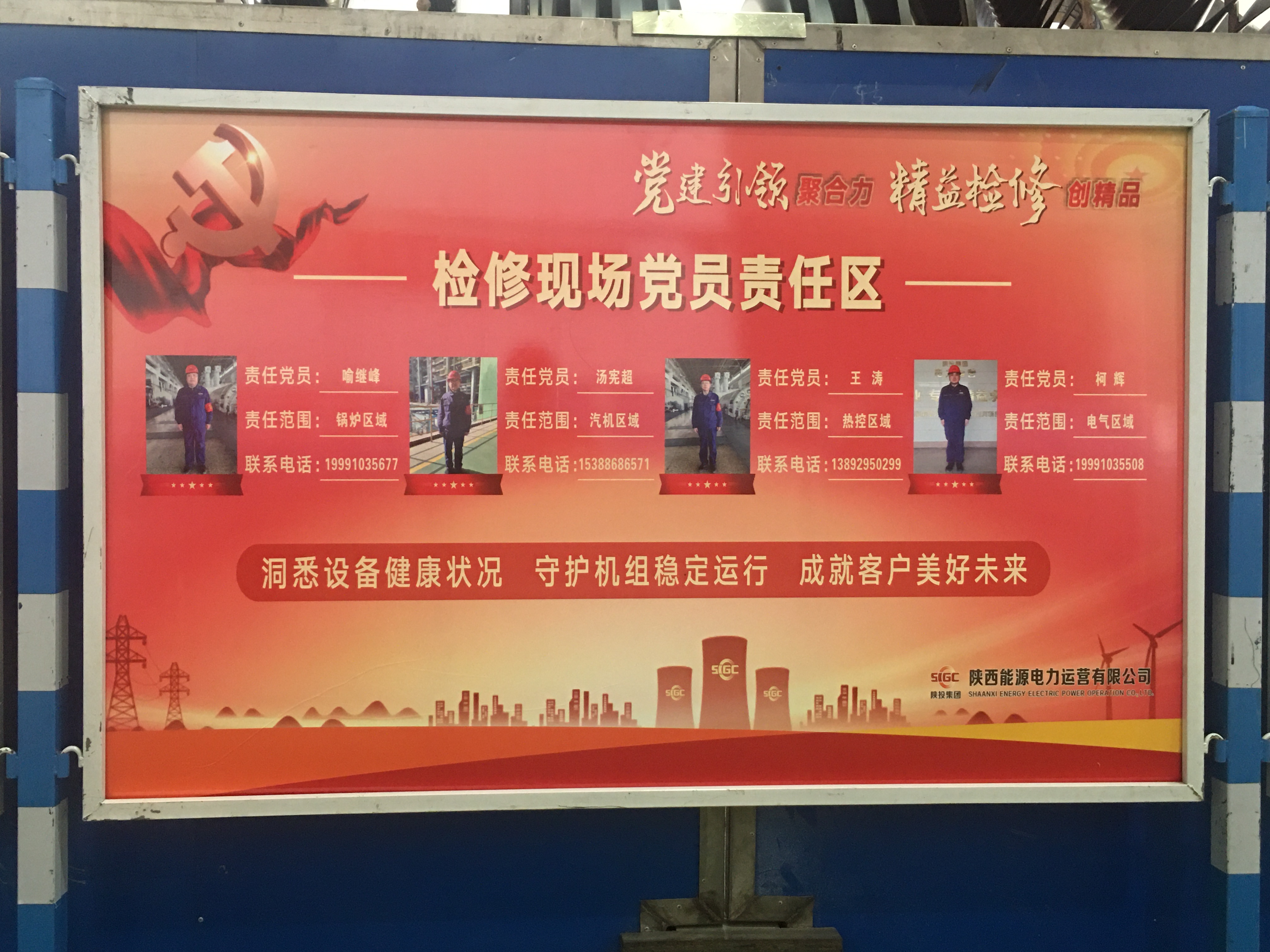 “發揮黨員模范帶頭作用,以身作則按期完成檢修任務!”一塊塊鮮紅的“黨員責任區”和“黨員承諾”展板,真正使黨員身份亮出來、作用顯出來、形象立起來。
