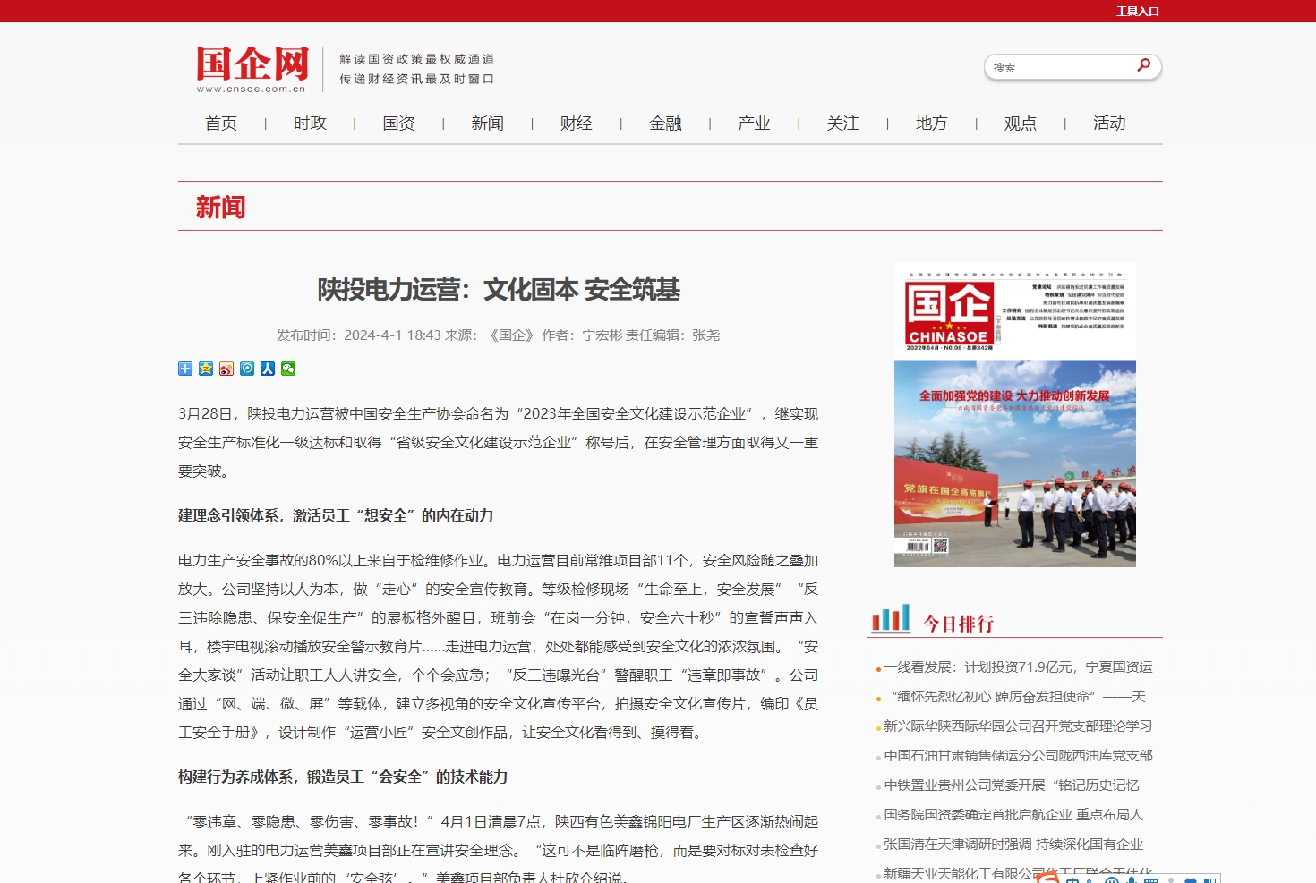 3月28日,陜投電力運營被中國安全生產協會命名為“2023年全國安全文化建設示范企業”,繼實現安全生產標準化一級達標和取得“省級安全文化建設示范企業”稱號后,在安全管理方面取得又一重要突破。
