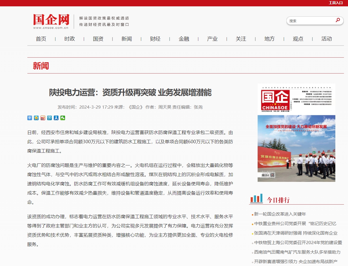 該資質(zhì)的成功辦理,標志著電力運營在防水防腐保溫工程施工領(lǐng)域的專業(yè)水平、技術(shù)水平、服務(wù)水平等得到了政府主管部門和業(yè)主方的認可,為公司實現(xiàn)多元發(fā)展提供了有力保障。電力運營將充分發(fā)揮資質(zhì)優(yōu)勢和技術(shù)優(yōu)勢,豐富拓展資質(zhì)種類,增強核心功能,為業(yè)主方提供更加全面、專業(yè)的火電檢修服務(wù)。