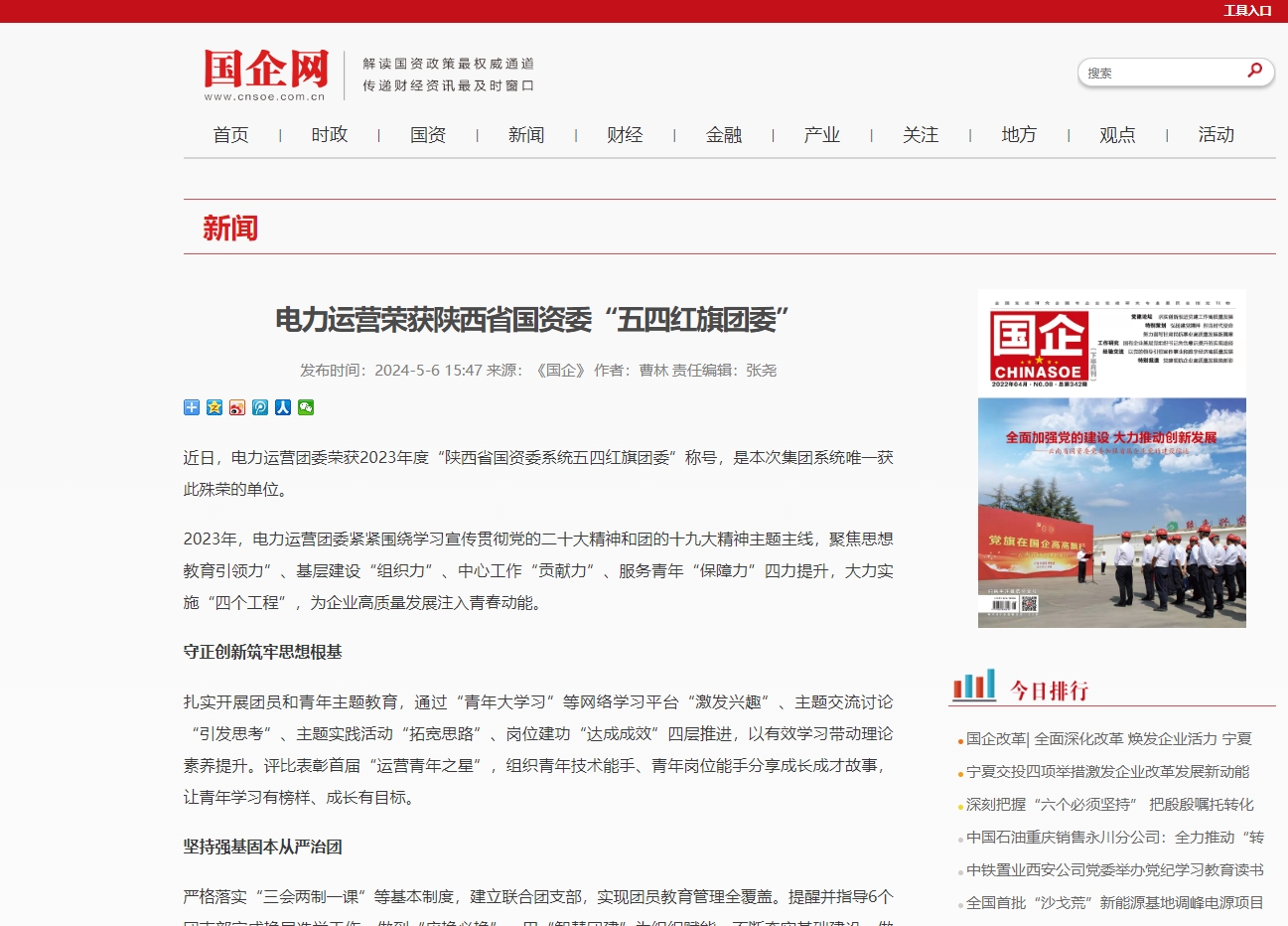 近日,電力運營團委榮獲2023年度“陜西省國資委系統五四紅旗團委”稱號,是本次集團系統唯一獲此殊榮的單位。