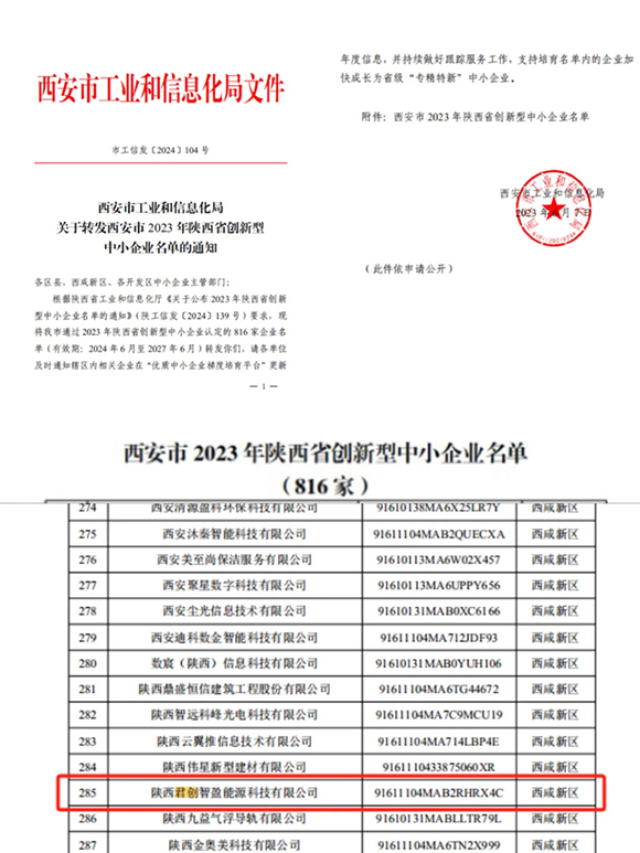 日前,君創科技順利通過陜西省工業和信息化廳認定,獲得“2023年陜西省創新型中小企業”。