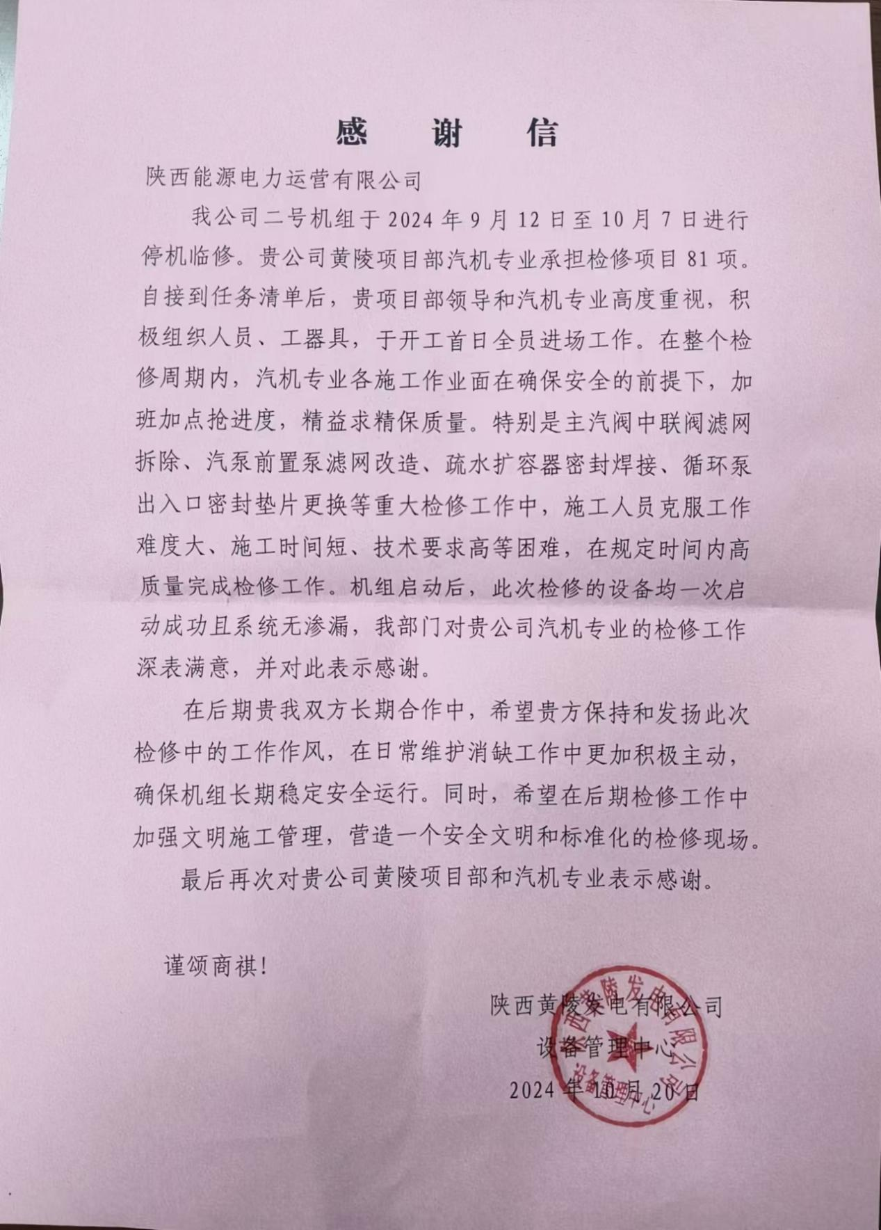 10月20日,黃陵項目部收到業主發來的感謝信,對項目部高質量完成#2機組臨修工作給予高度認可。