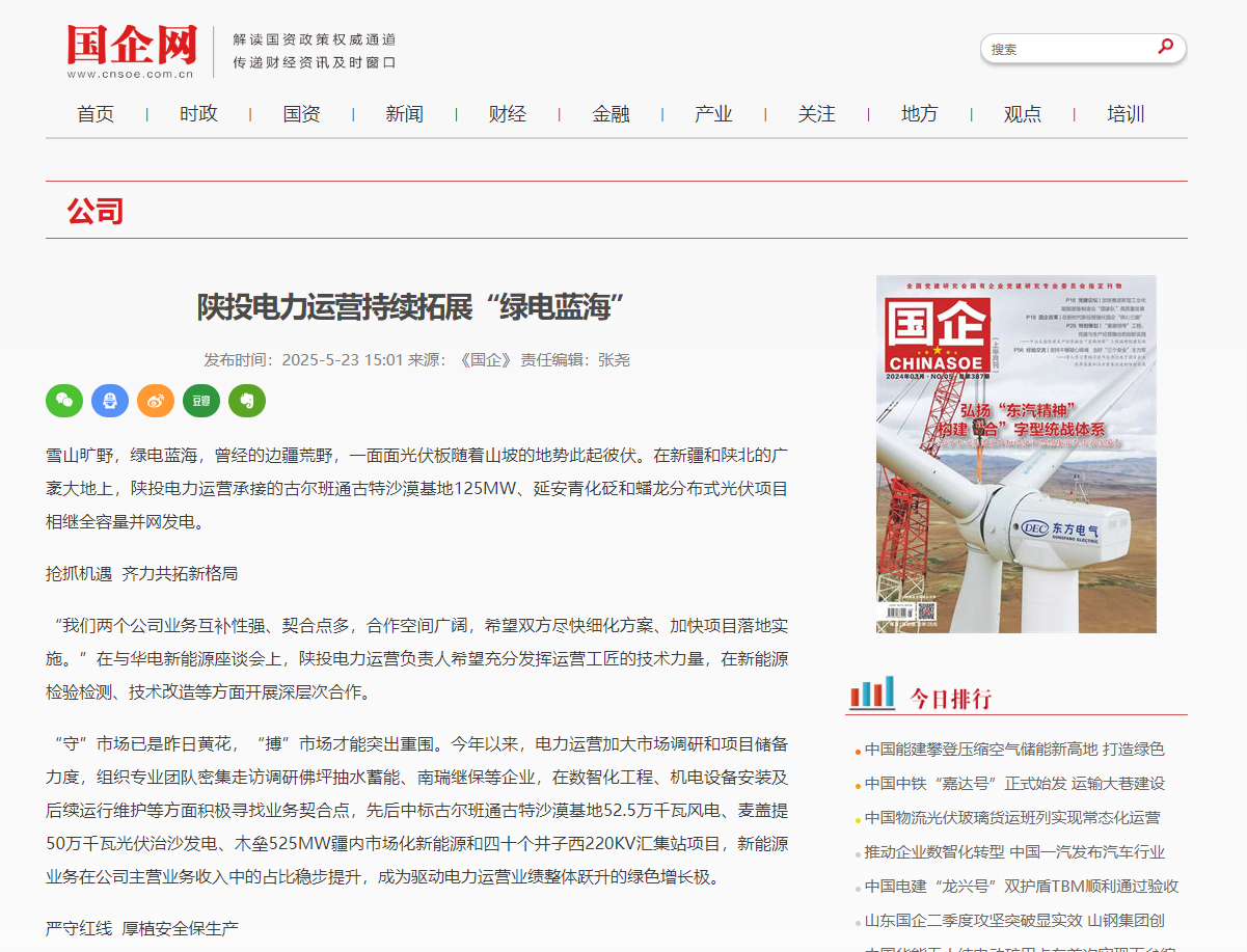 “我們兩個公司業務互補性強、契合點多,合作空間廣闊,希望雙方盡快細化方案、加快項目落地實施。”在與華電新能源座談會上,陜投電力運營負責人希望充分發揮運營工匠的技術力量,在新能源檢驗檢測、技術改造等方面開展深層次合作。