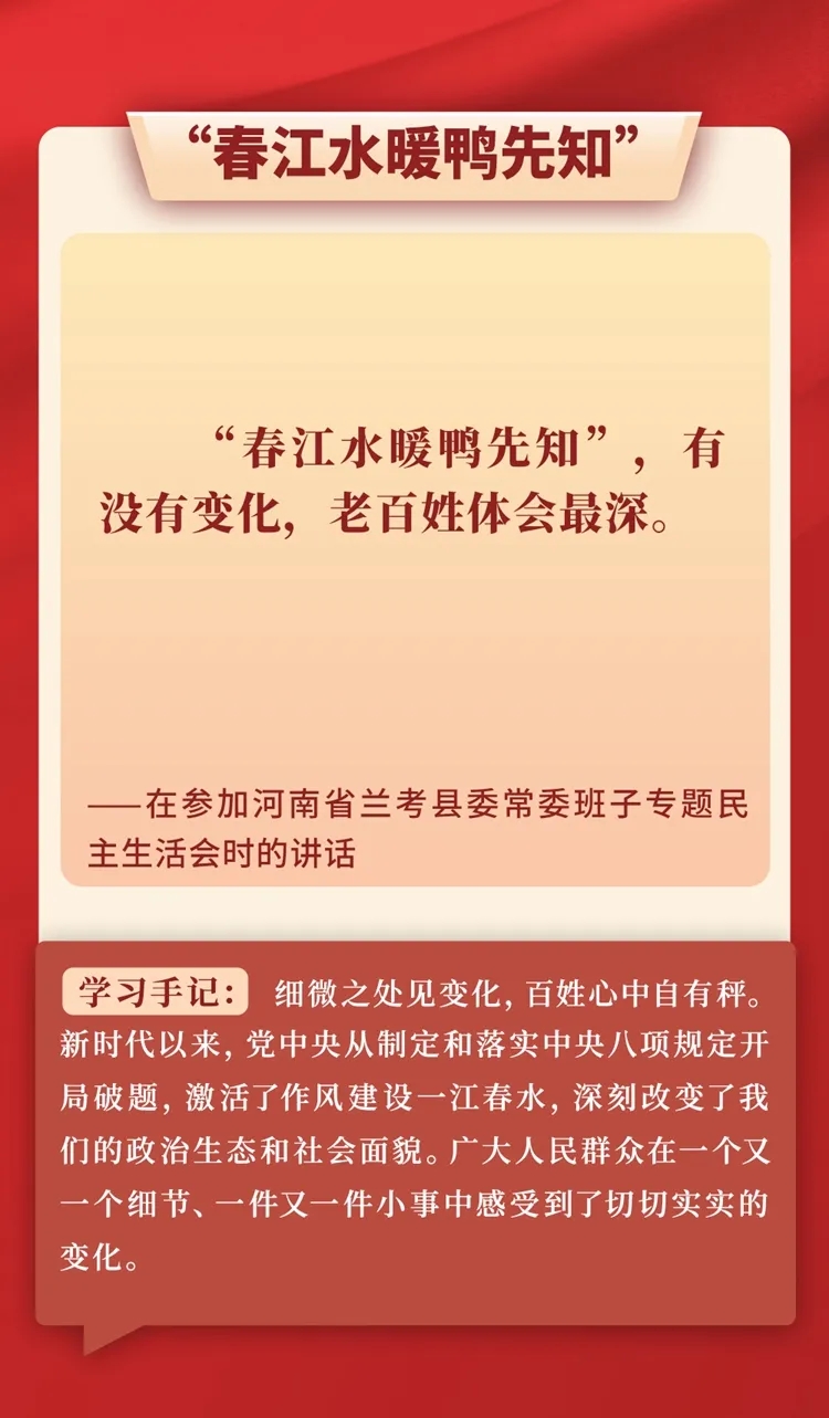“問(wèn)渠那得清如許?為有源頭活水來(lái)。”關(guān)于作風(fēng)建設(shè),習(xí)近平總書(shū)記常引用各種古語(yǔ)典故,有的從警示層面講危害,有的從倡導(dǎo)層面談踐行,旁征博引、畫(huà)龍點(diǎn)睛,把古人智慧化用于作風(fēng)建設(shè)的當(dāng)代實(shí)踐,給人以思想啟迪、靈魂洗禮。
