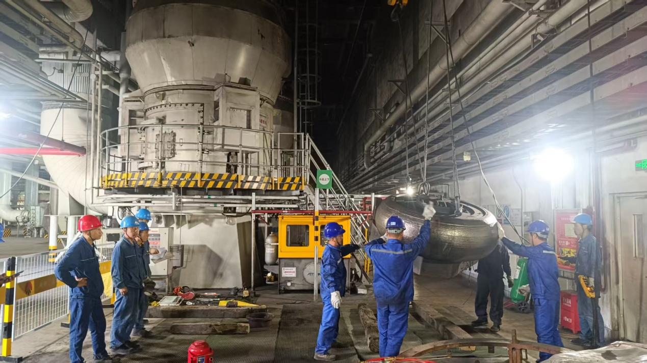 設備檢查過程中,磨輥徑向油封漏油隱患意外“現身”,項目部立即啟動“以修代訓”方案,組織各類技術人員全程參與,推進隱患消除與檢修同步開展。老師傅手持工具精準發力,數十名青工快速圍攏,眼睛緊盯著老師傅手腕的每一次發力,從第一顆螺栓的旋轉,到笨重部件的平穩起吊,目光始終追隨著工具的運動軌跡。