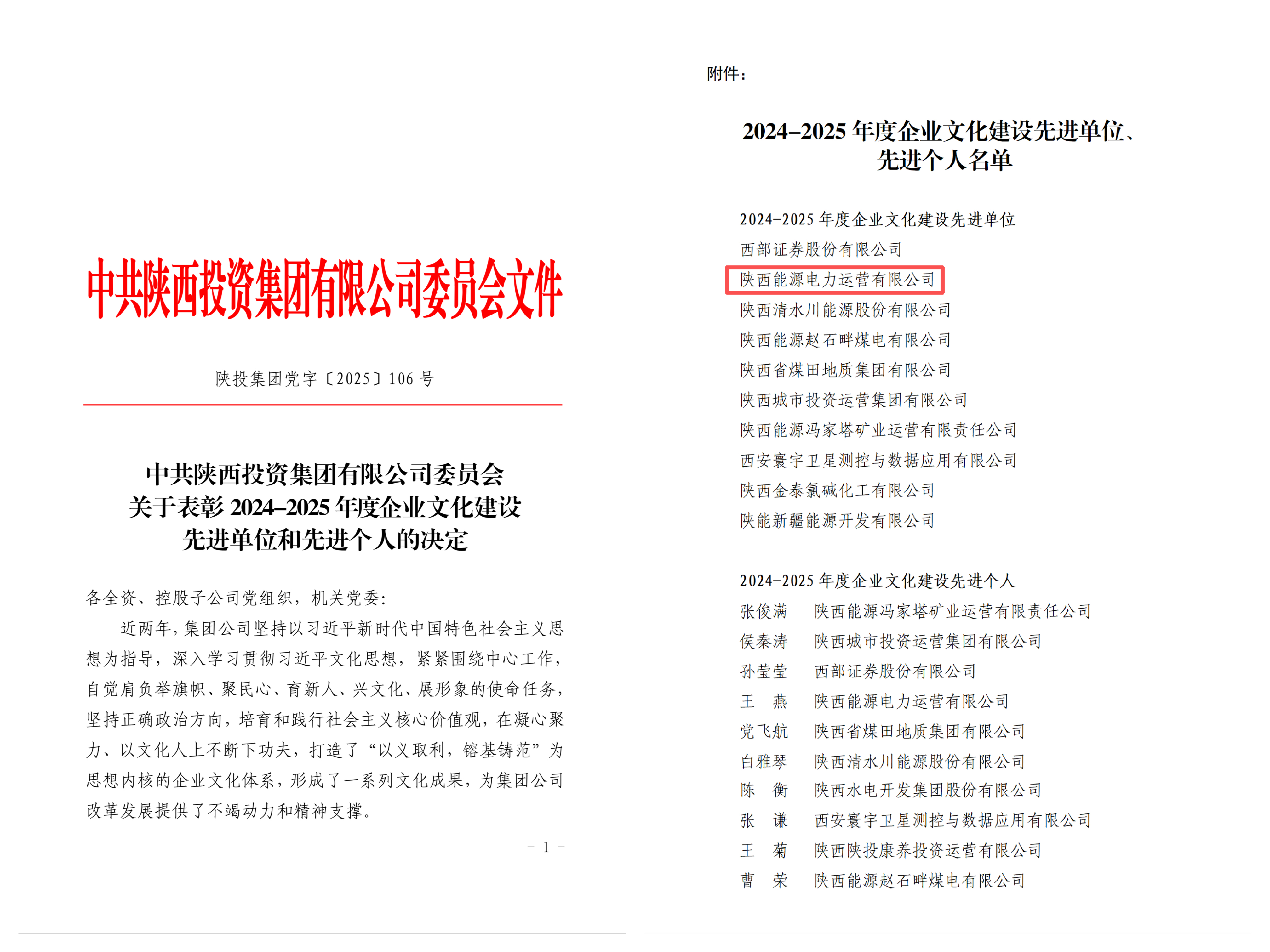 日前,在陜投集團2024-2025年度企業文化建設先進評選中,公司被授予“企業文化建設先進單位”榮譽稱號,黨委工作部王燕榮獲“企業文化建設先進個人”,富縣項目部綜合班班長馬鵬飛獲評“一線崗位標兵”。