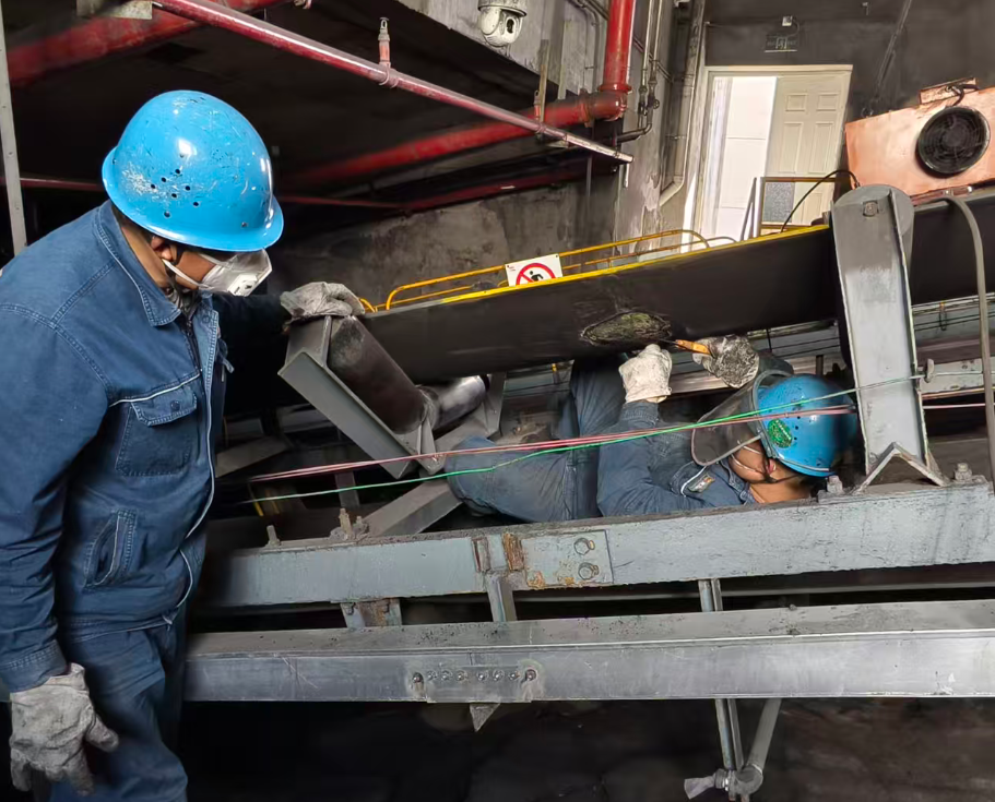 在不足半米高的皮帶輸送架下,輸煤檢修班張保亮半躺在地,蜷縮身體,在彌漫的粉塵中仔細排查每一個連接點和磨損處。他目光如炬,緊盯著每個細節(jié),這個看似“躺平”的姿勢,恰恰是為了讓這條生產(chǎn)的“咽喉”要道能夠穩(wěn)穩(wěn)地順暢運行。