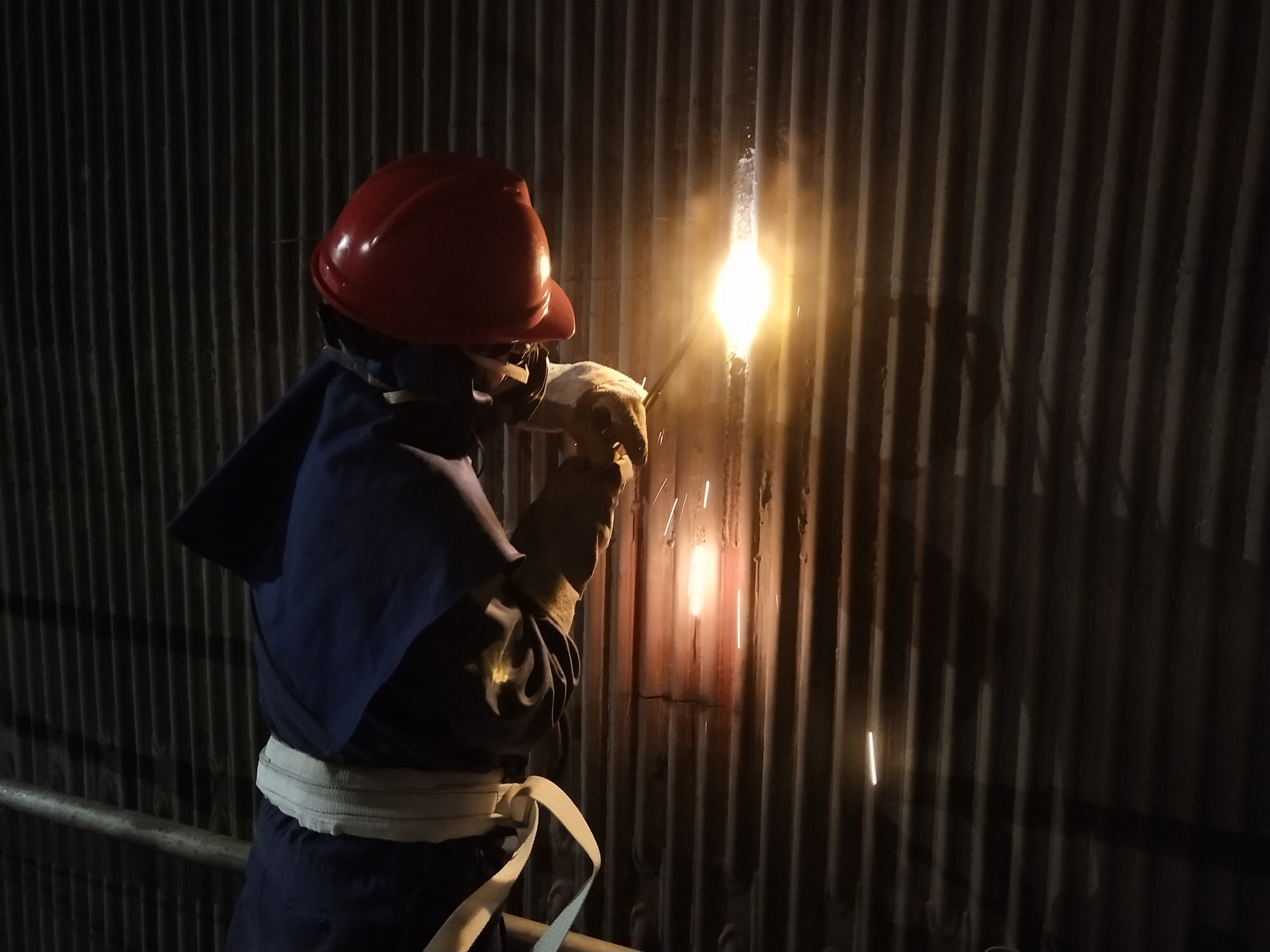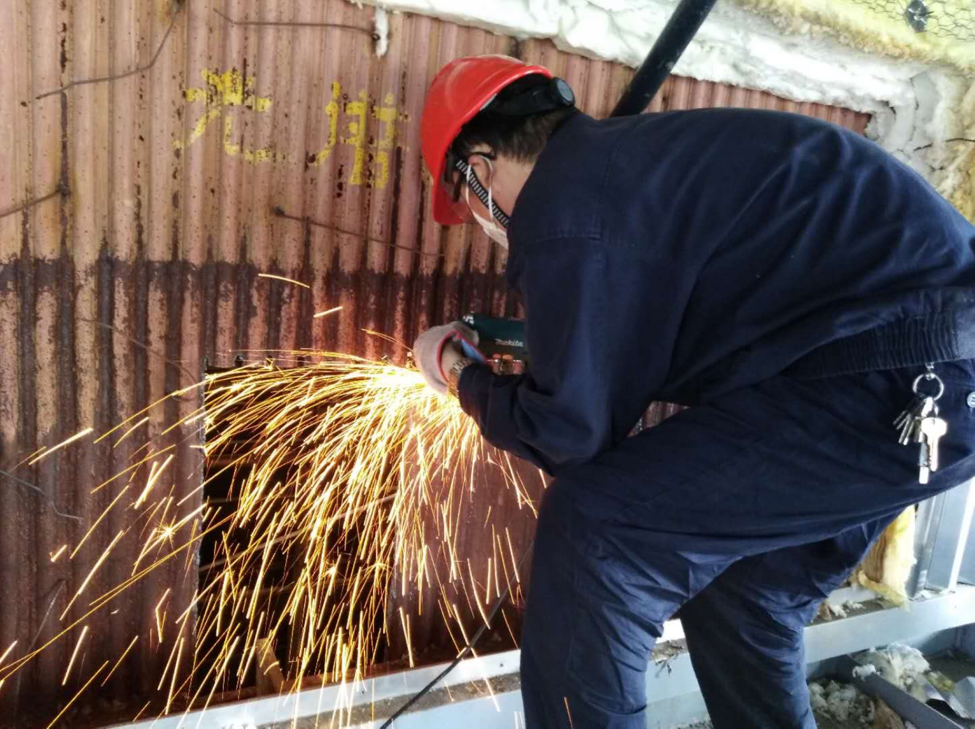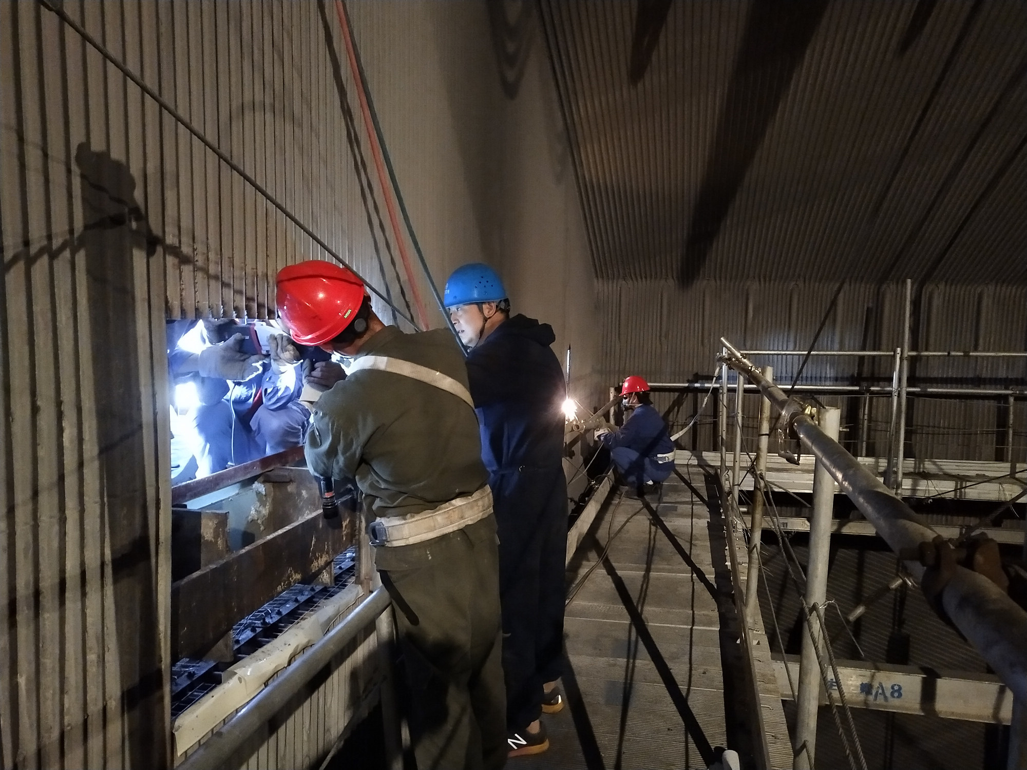 6月7日端午節,在萬家團聚的日子,項目部鍋爐班開始了#2爐水冷壁66根管道更換的前期準備工作。爐膛內,煤粉、保溫渣,夾雜著鐵屑飛揚。工作人員站在距地面56米高的腳手架上切除水冷壁管、制水冷壁管坡口、磨鰭片、清除管壁內外銹,各小組有條不紊地開展工作。至6月9日收假前,水冷壁管焊接前準備工作已全部就緒,為節后焊接工作的順利開展,創造了條件。 (趙 濤 王武軍)