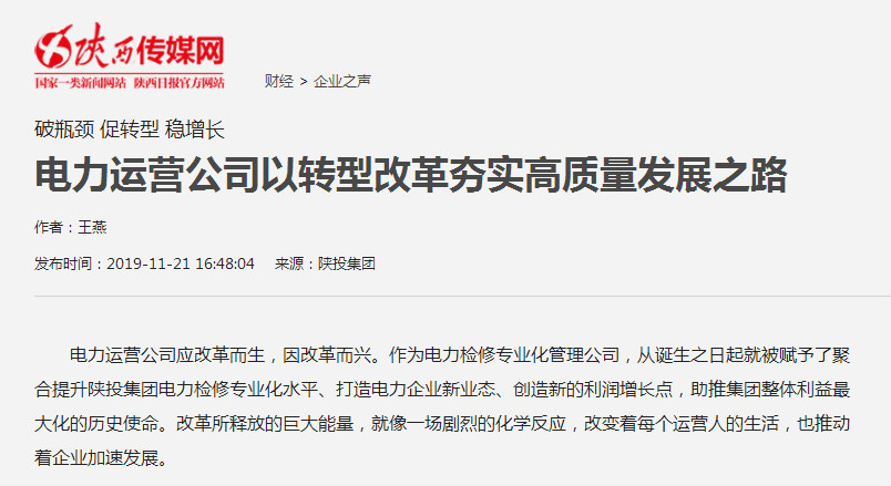 電力運營公司應改革而生,因改革而興。作為電力檢修專業化管理公司,從誕生之日起就被賦予了聚合提升陜投集團電力檢修專業化水平、打造電力企業新業態、創造新的利潤增長點,助推集團整體利益最大化的歷史使命。改革所釋放的巨大能量,就像一場劇烈的化學反應,改變著每個運營人的生活,也推動著企業加速發展。