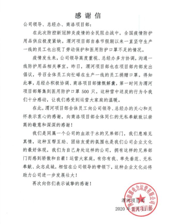 一方有難,八方支援,在渭河項目部疫情防控的最困難時期,作為甲方的渭電有限公司得知情況,立即伸出援手,為渭河項目部送來醫用口罩316只。渭電公司副總經理黃衛東說:“渭河項目部與渭電公司本是一家,只因改革成為兄弟單位。我們同居一處,同保生產,共同抗疫,肩負著共同的責任和使命。”