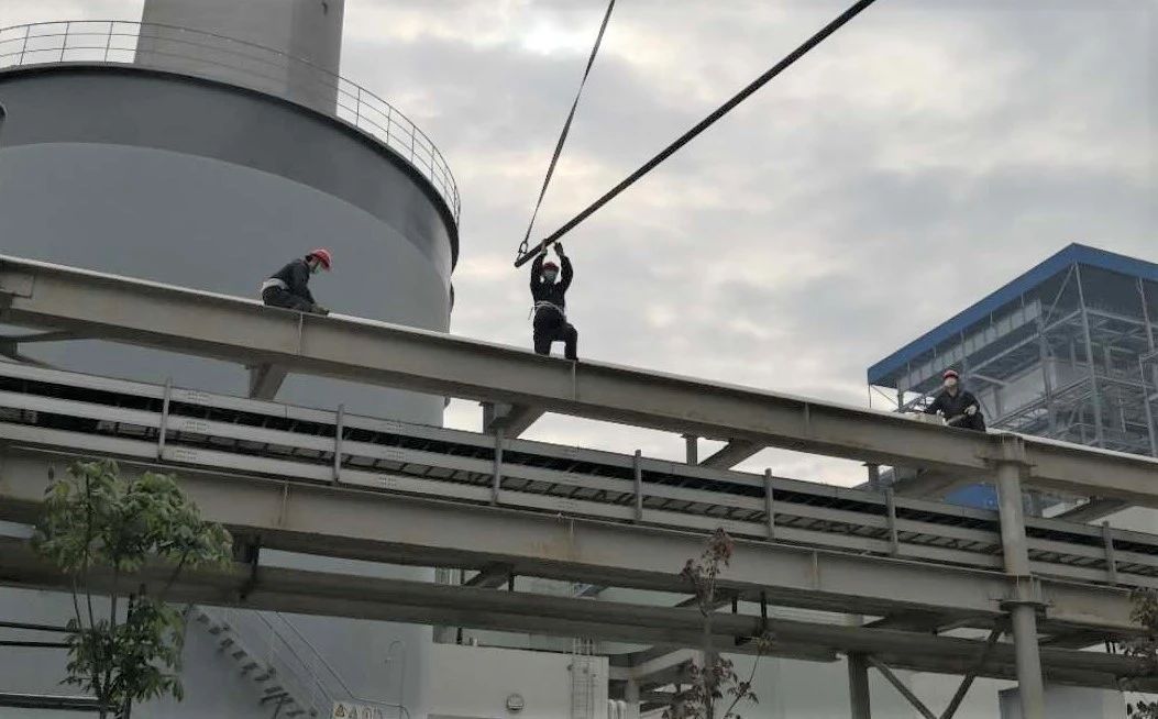 #1爐脫硫廢水改造施工現(xiàn)場,鍋爐班人員站在5米高的綜合管架上,配合著吊車,正在進行吊裝管道。此項工作屬高空作業(yè),工作現(xiàn)場又緊鄰氫氣管道,對作業(yè)安全等級要求異常嚴(yán)格。在消防隊的全程監(jiān)護下,工作人員各司其職,緊張而有序地進行著工作。
