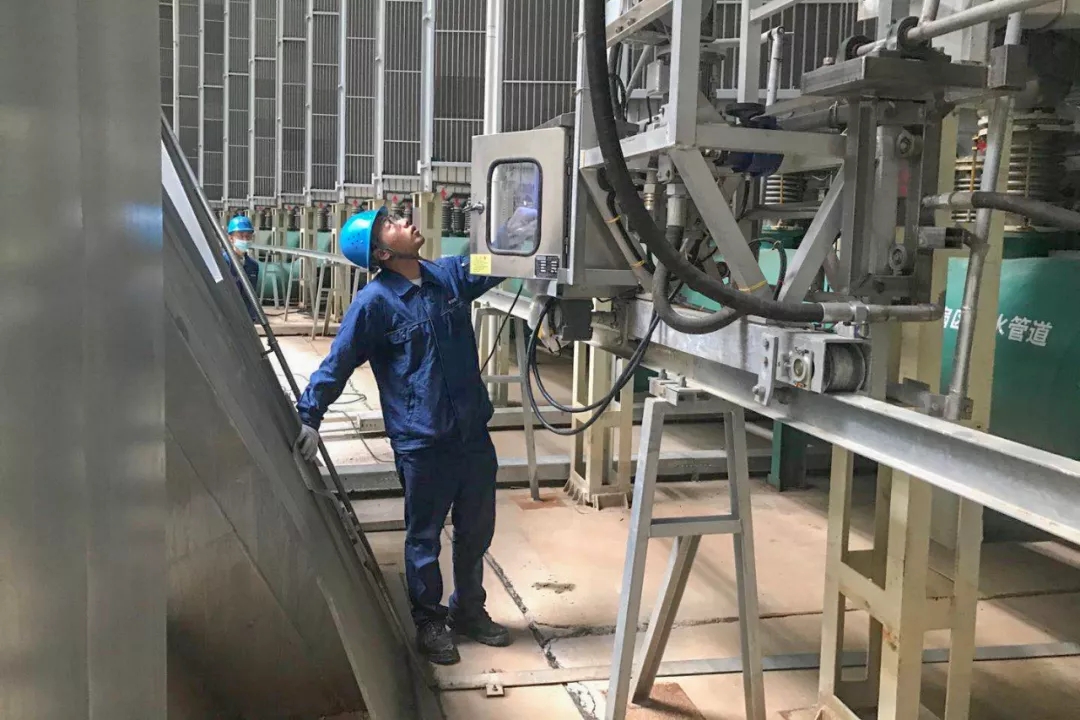機房外,30米高間冷塔內,機務隊組織儀電一班、綜合班和汽化水班的人員團結協作,正在搭設腳手架修,為即將開始的沖洗小車軌道修復工作精心準備。