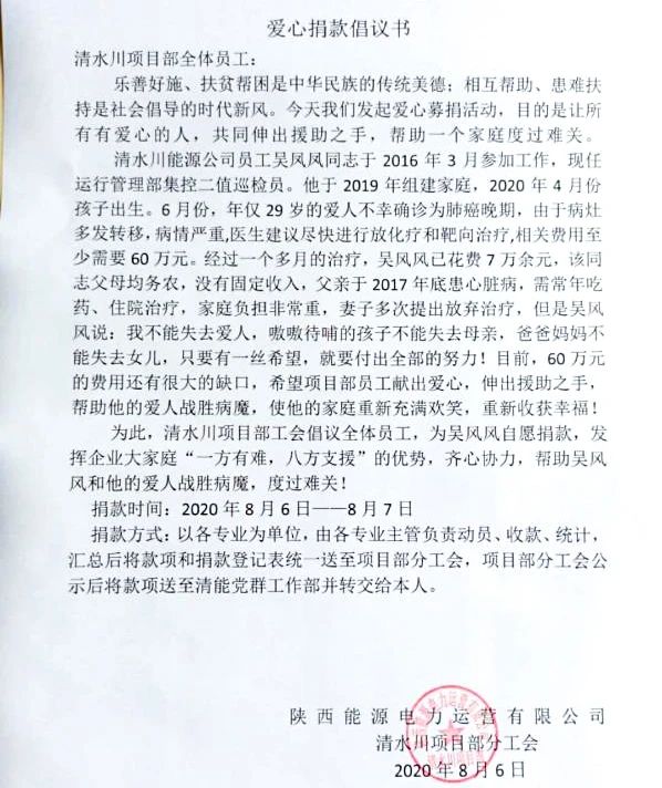 近日,在得知清水川能源職工吳風風愛人不幸身染重病,目前在醫(yī)院治療,費用仍有很大缺口的消息后,清水川項目部分工會立即向全體職工發(fā)出倡議,號召大家發(fā)揚互助、關愛的精神,伸出手來幫助吳風風和家人戰(zhàn)勝病魔,渡過難關!