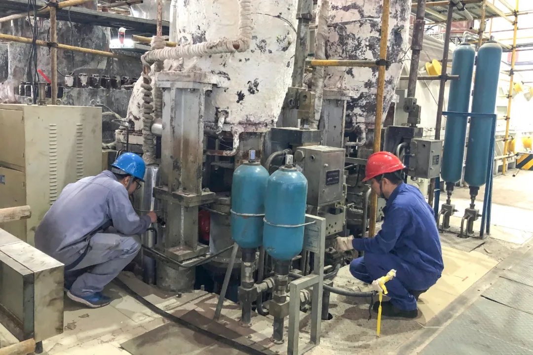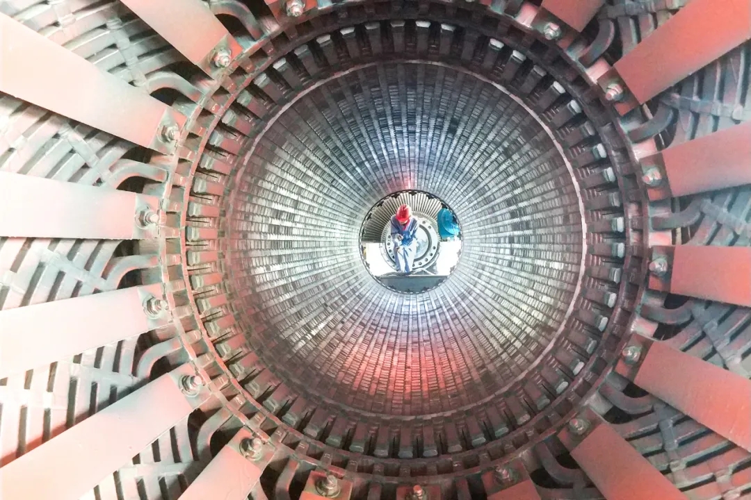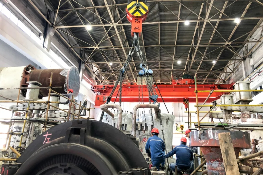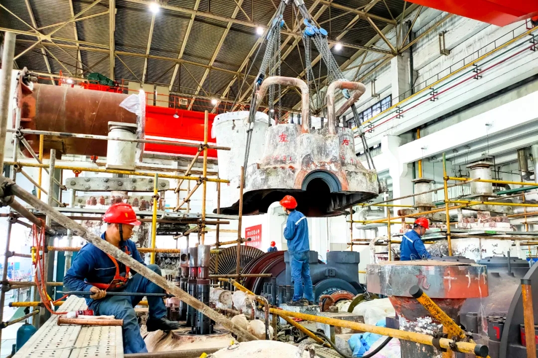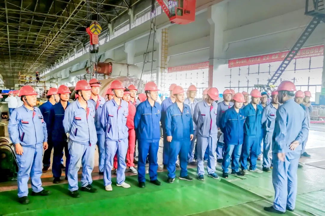 檢修現(xiàn)場,在起重人員的指揮下,在兩臺行車的配合下,轉(zhuǎn)子一寸一寸緩緩向外移動。此刻,從A級檢修開始以來,24小時堅守現(xiàn)場的機務隊主機班人員正全神貫注,或守在轉(zhuǎn)子兩側(cè)精心維護、或鉆入發(fā)電機內(nèi)認真觀察動靜間隙,每一項工作都一絲不茍。