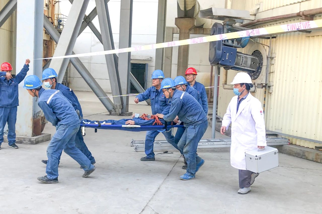 演練以工作人員在#3爐吸收塔閥門作業時發生事故為內容展開。事故發生后,項目部立即啟動應急救援預案,對事故進行急救處理,對現場進行警戒隔離。應急救援小組在專人的引導下迅速進入現場,對傷者進行止血、腿部固定后,立即將其抬上救護車,緊急送往醫院。