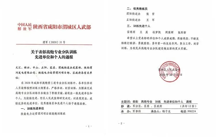 10月25日,在結(jié)訓(xùn)總結(jié)表彰大會上,國防動員單位領(lǐng)導(dǎo)對渭河項(xiàng)目部參訓(xùn)人員的表現(xiàn)給予充分肯定,對他們雷厲風(fēng)行的作風(fēng)和頑強(qiáng)拼搏的精神給予高度贊揚(yáng)。“陜能電力運(yùn)營渭河項(xiàng)目部高炮訓(xùn)練班”被咸陽市渭城區(qū)人民武裝部評為“年度訓(xùn)練先進(jìn)單位”,張彤新同志被評為“年度訓(xùn)練先進(jìn)個人”,并予以通報(bào)表彰,為公司贏得了榮譽(yù)。