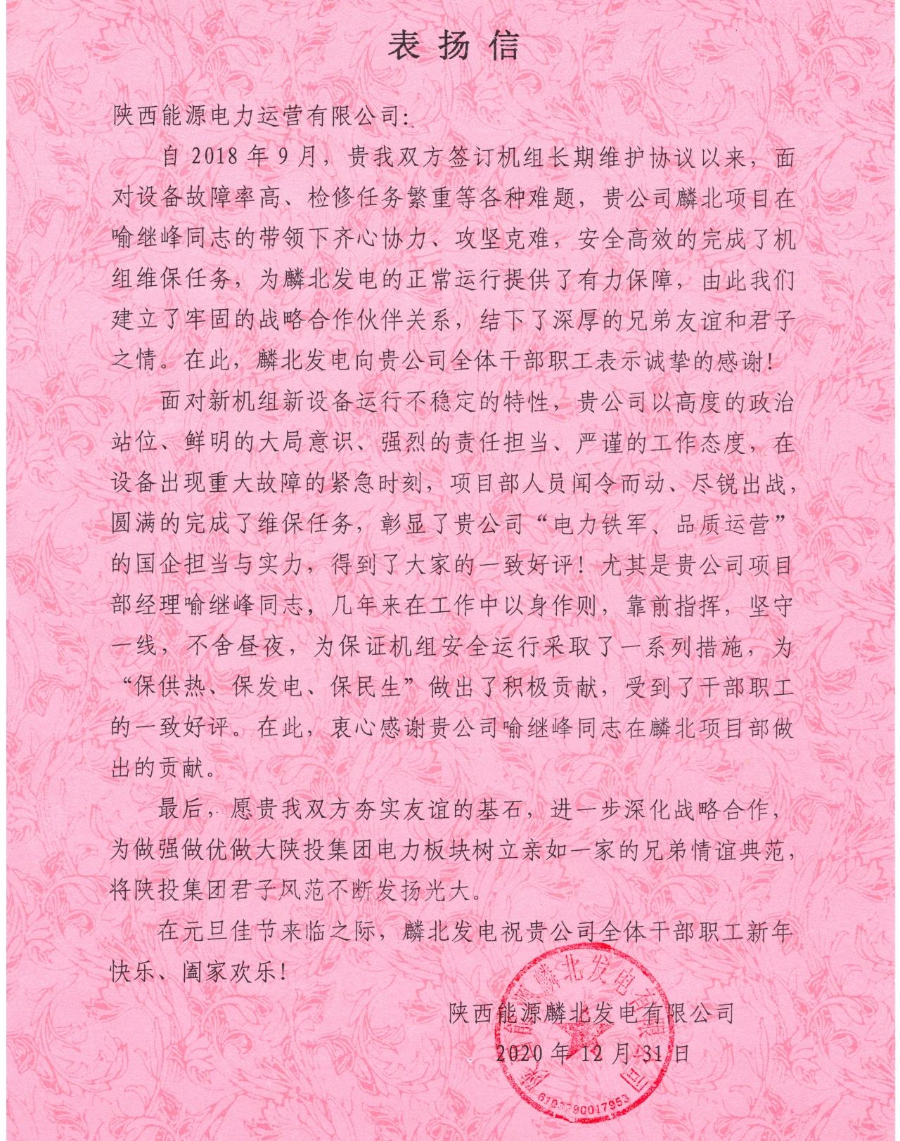 收到感謝信后,公司上下深受鼓舞,認(rèn)為這封表揚(yáng)信既是業(yè)主方對(duì)公司既往工作的肯定,又是對(duì)項(xiàng)目部員工堅(jiān)守一線默默奉獻(xiàn)的褒獎(jiǎng)!在今后的工作中,公司將進(jìn)一步加強(qiáng)與麟北發(fā)電的戰(zhàn)略合作,優(yōu)質(zhì)高效完成各項(xiàng)檢修維保任務(wù),為做強(qiáng)做優(yōu)做大集團(tuán)電力板塊、樹立親如一家的兄弟情誼典范做出不懈努力。