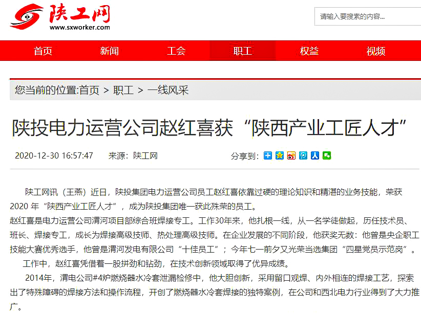 趙紅喜是電力運(yùn)營公司渭河項(xiàng)目部綜合班焊接專工。工作30年來,他扎根一線,從一名學(xué)徒做起,歷任技術(shù)員、班長、焊接專工,成長為焊接高級(jí)技師、熱處理高級(jí)技師。在企業(yè)發(fā)展的不同階段,他獲獎(jiǎng)無數(shù):他曾是央企職工技能大賽優(yōu)秀選手,他曾是渭河發(fā)電有限公司“十佳員工”;今年七一前夕又光榮當(dāng)選集團(tuán)“四星黨員示范崗”。