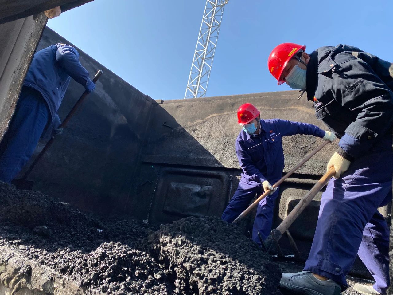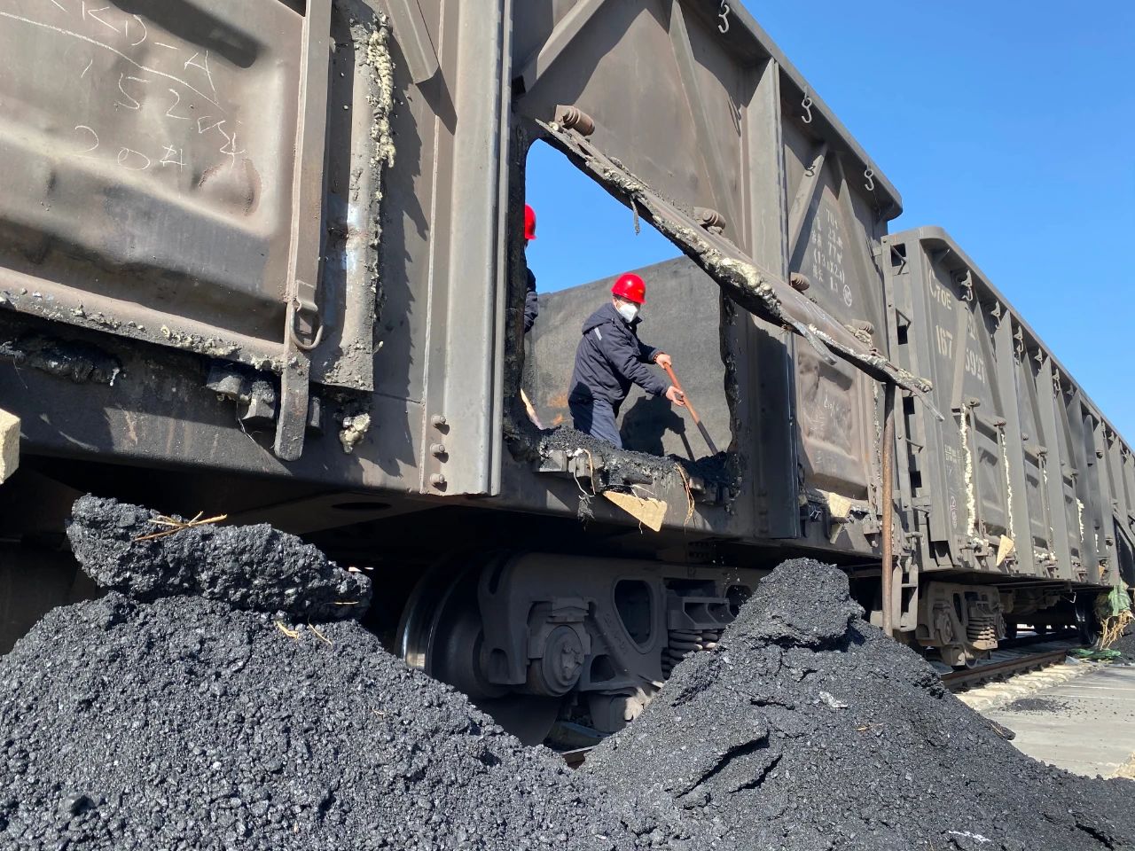 1月12日,商洛項目部從管理干部中緊急抽調18名人員奔赴煤場,對“凍煤”展開人工清理。清理凍煤是一項費勁的體力活,更是一項費時的細活。車廂內,工作人員有序分工,揮動鐵鎬和鐵鍬,清理著車廂底部、拐角等處的凍煤。厚厚的凍煤堅硬如鐵,工作人員掄圓胳膊,使勁揮動鎬頭卻只“啃”下很小的一塊。一鎬鎬挖,一塊塊敲,一點點清,清理完一節車廂,汗水早已濕透了棉服,卻沒有一個人停下手上的活,又馬不停蹄轉戰另一節車廂。